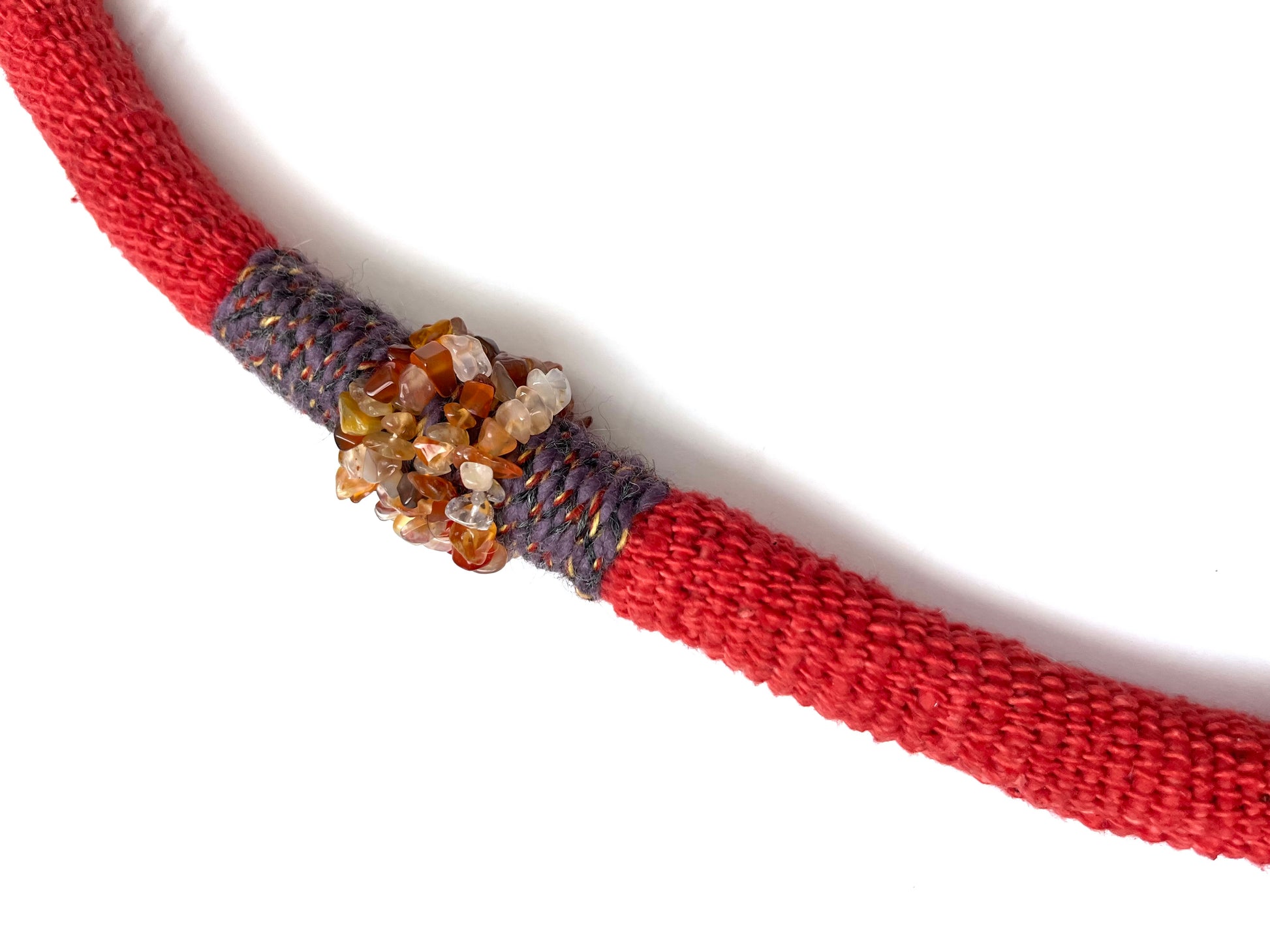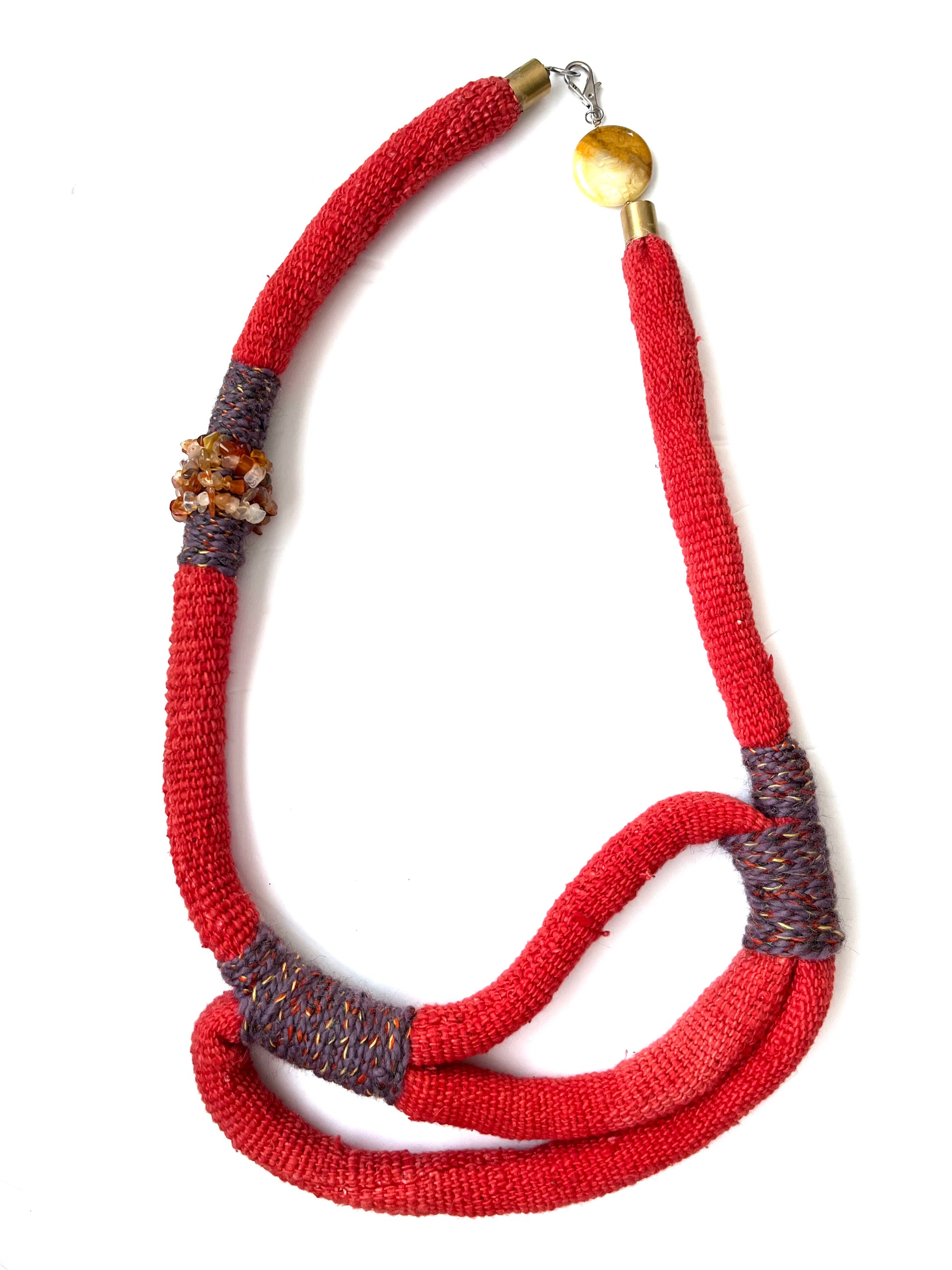 By fashioning loops in over 5’ of burnt orange mudcloth cord with strategically positioned braided threads, I have attempted to create an illusion of movement in a static form. A cluster of agate stones and a yellow fossil coral coin provide earthy texture.