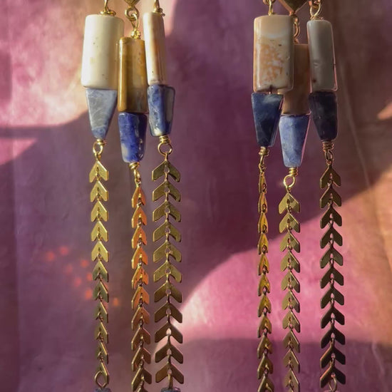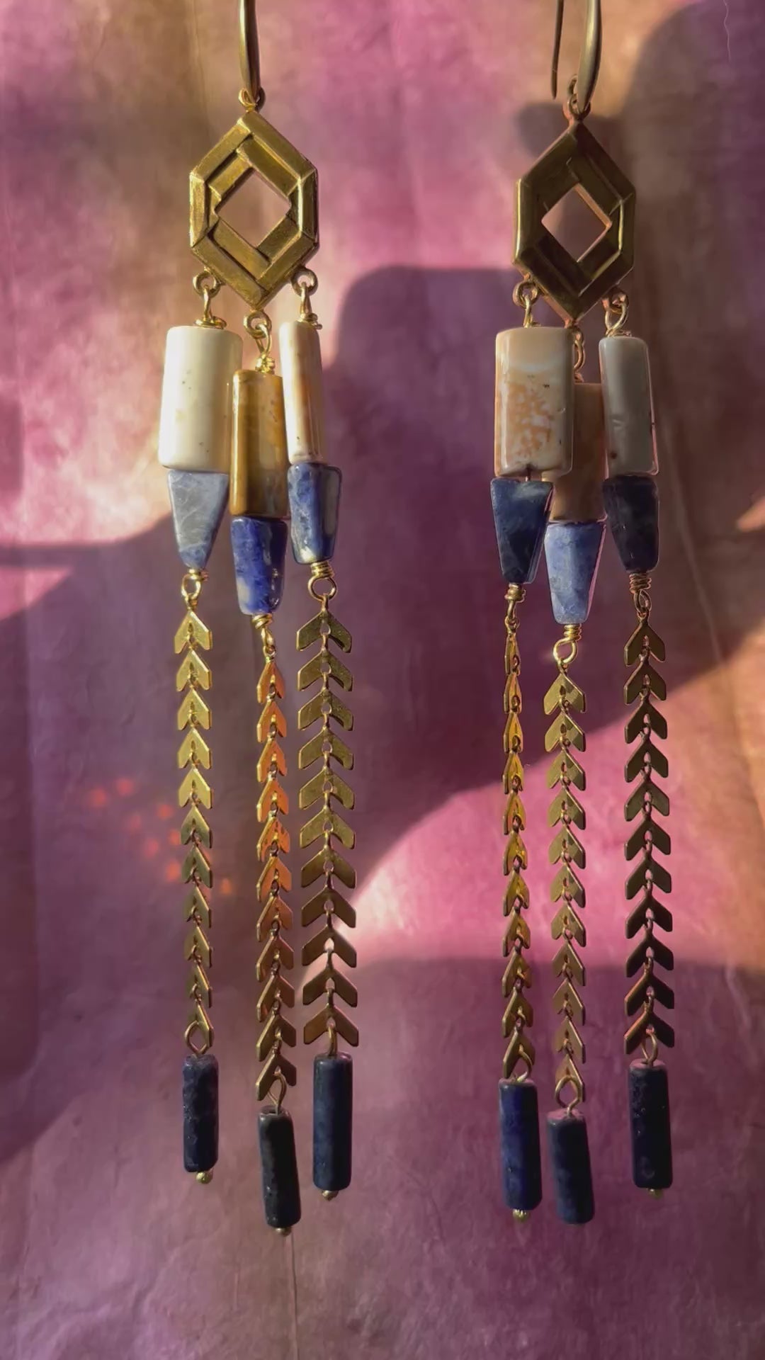 Geometric and organic forms play and repeat in this delightfully long, 5”/13 cm multi-strand pair. Jasper, lapis lazuli and sodalite bring a welcome earthiness to stoic brass. The earrings hang on brass ear wires.