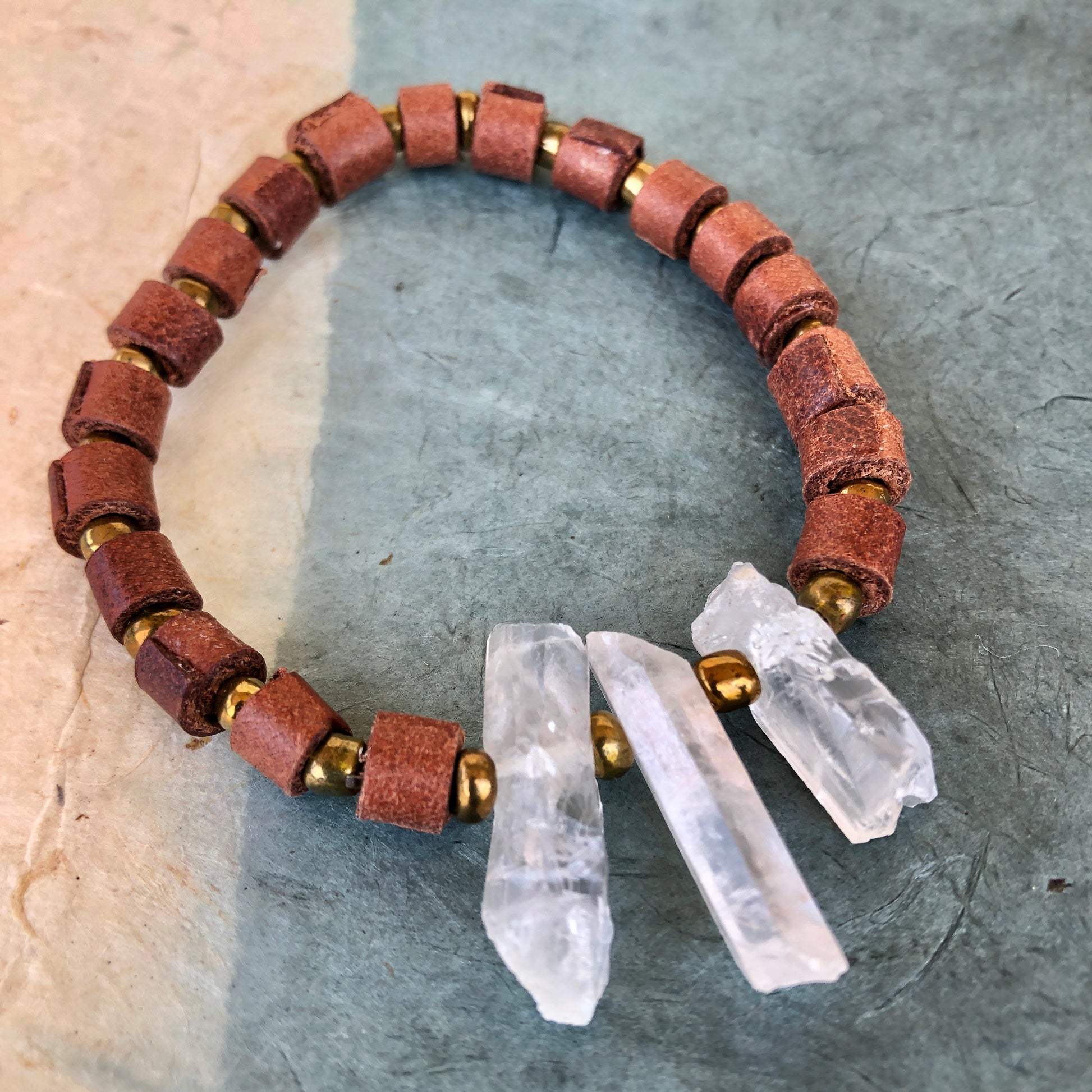 Part of the Reverie collection...hand-rolled full grain leather beads are accented with brass colored glass seed beads and finished with a quartz point focal. The bracelet is on stretchy elastic cord and measures approximately 7" in diameter (please let me know if you require size adjustments).
