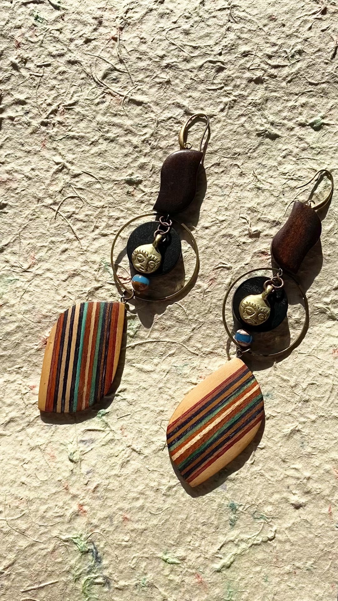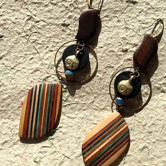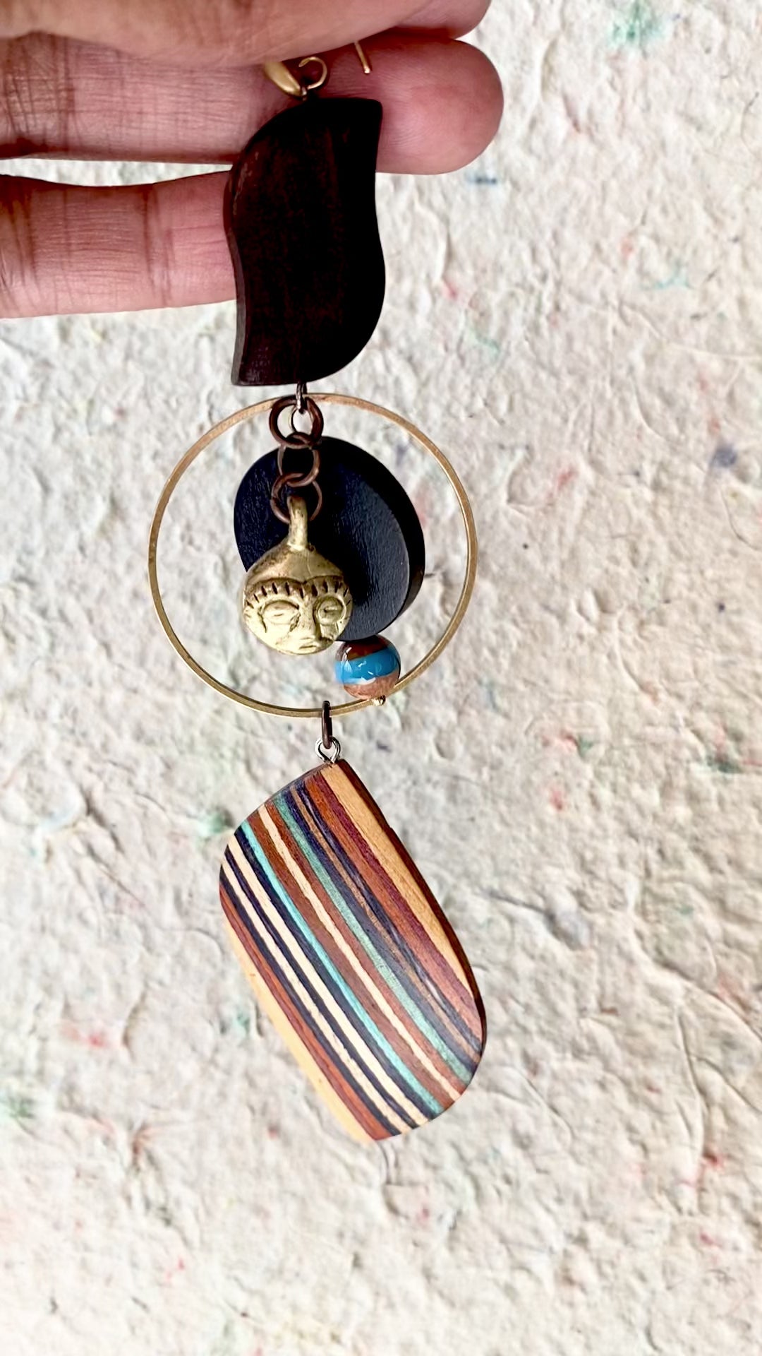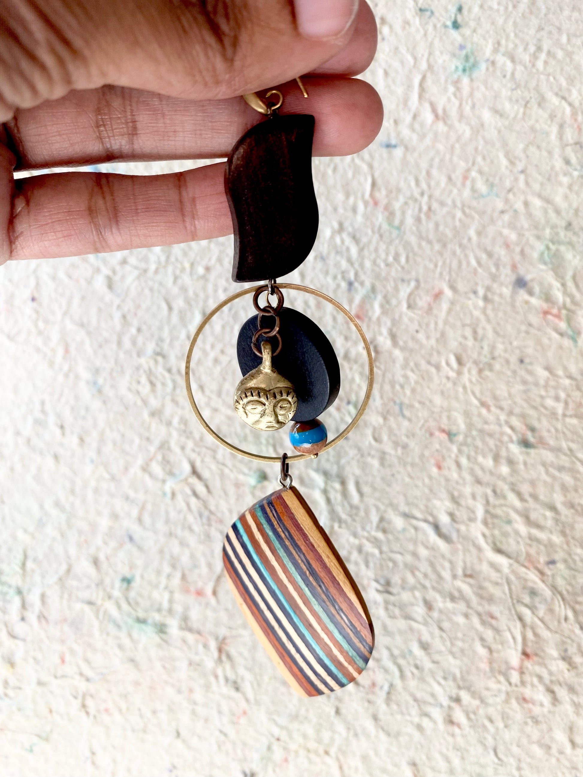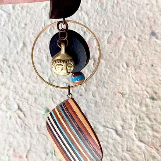 I upcycled pieced wood earring drops, adding a wood bead that echoes its shape, and suspended it from a brass hoop with a coin bead, brass mask pendant, and Tibetan agate. This is a one-of-a-kind item.