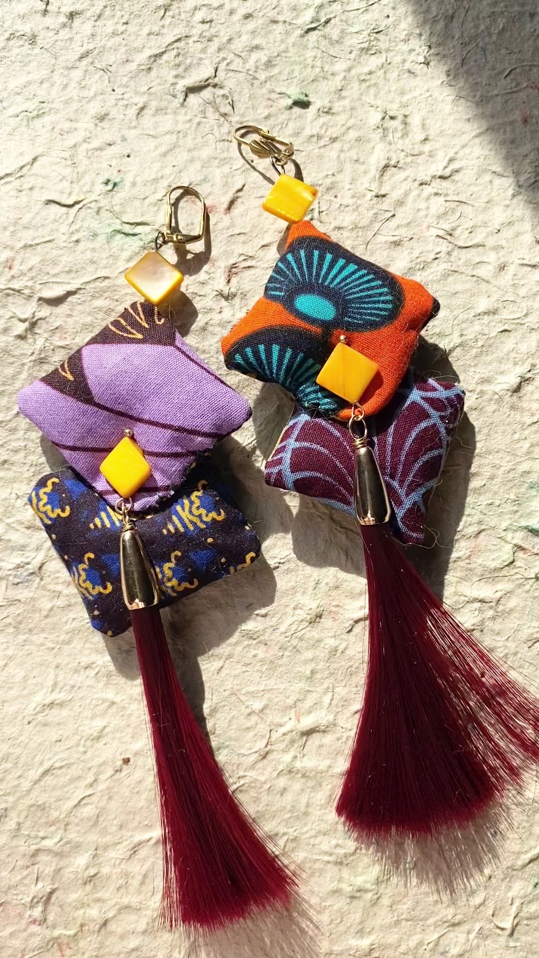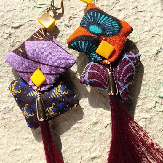 Mixed ankara fabric plush beads in a diamond shape are echoed by yellow mother-of-pearl beads and accented by a burgundy faux hair tassel. This is a one-of-a-kind pair, but more fabric and bead combinations are in the works!
