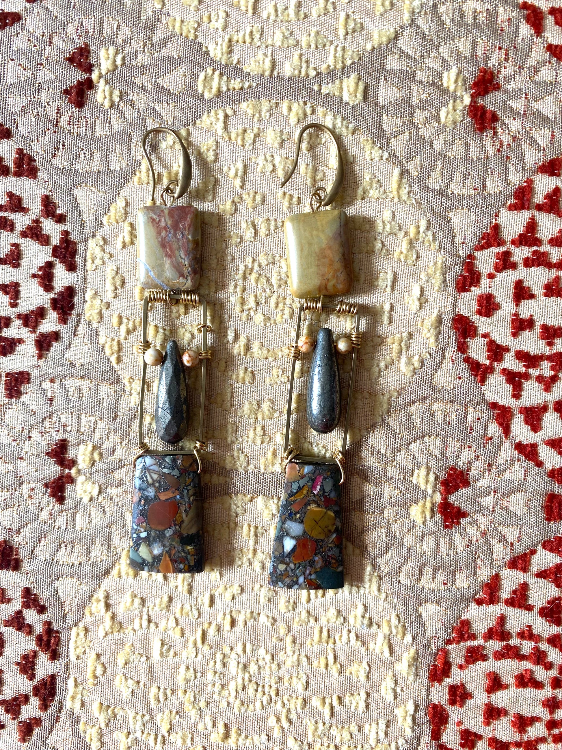 Geometric shapes are featured in these dangle earrings that include hickoryite, iron pyrite, and jasper components on a brass frame.