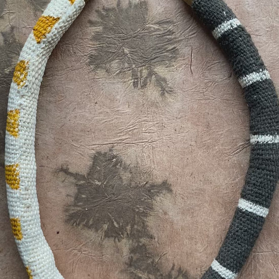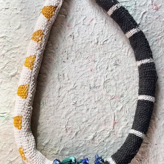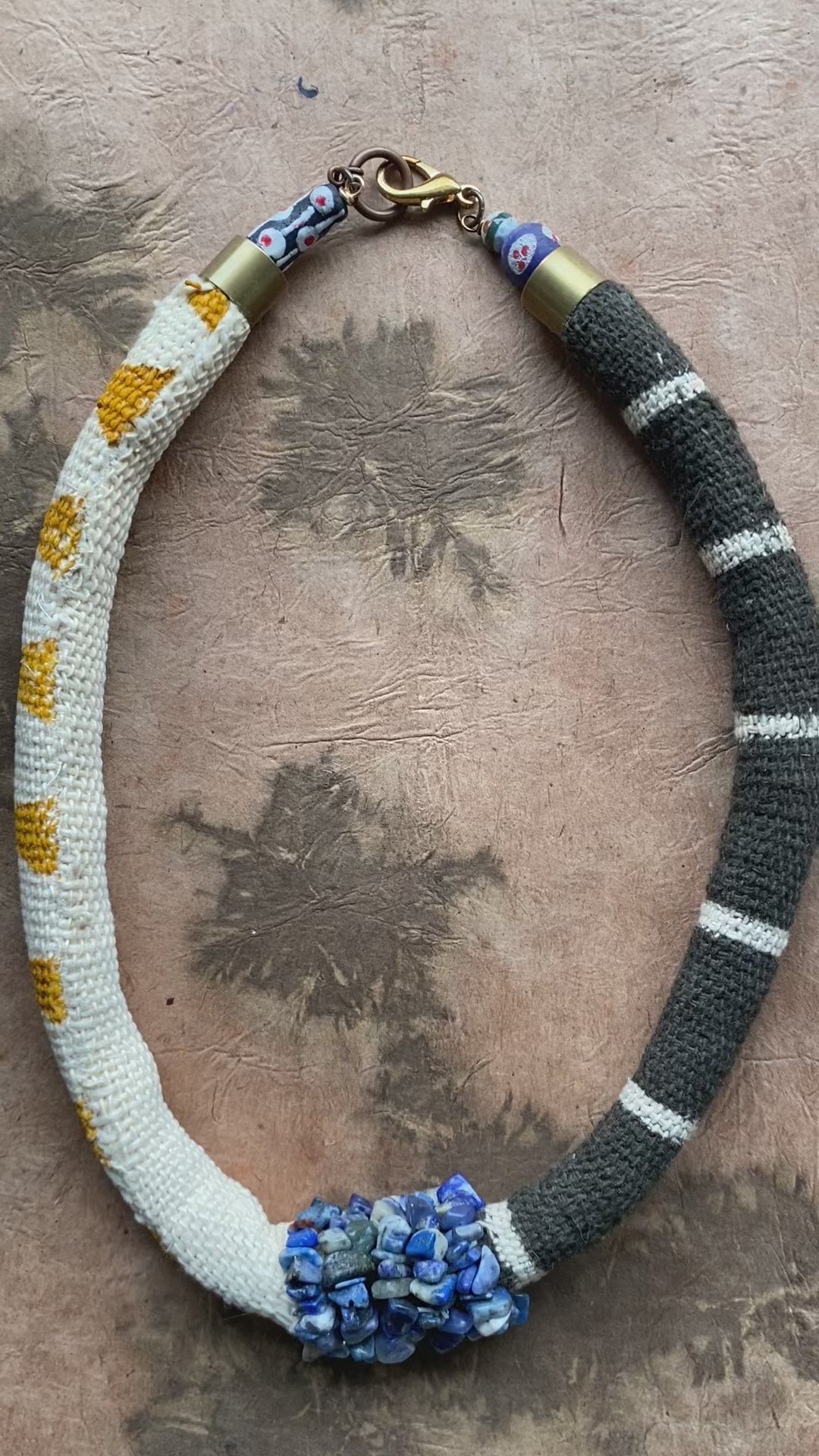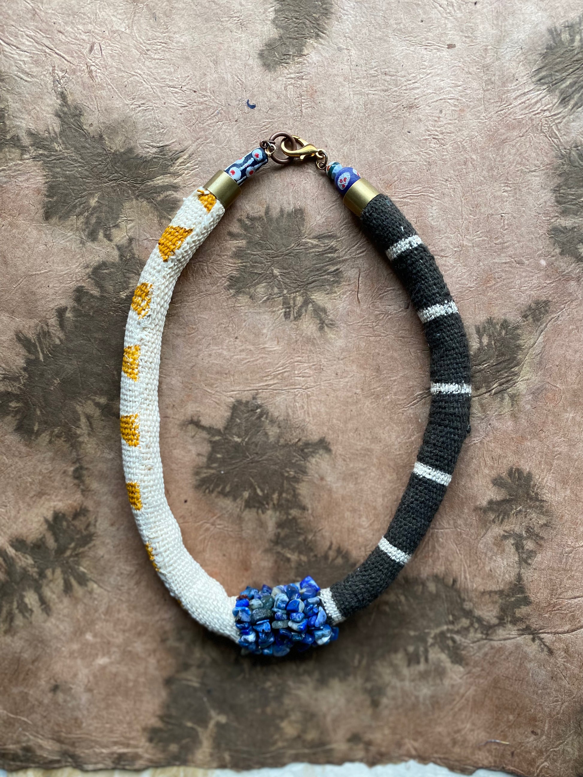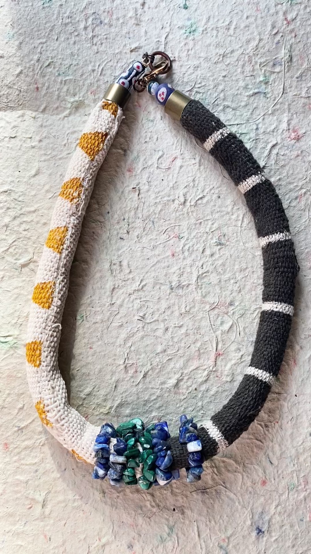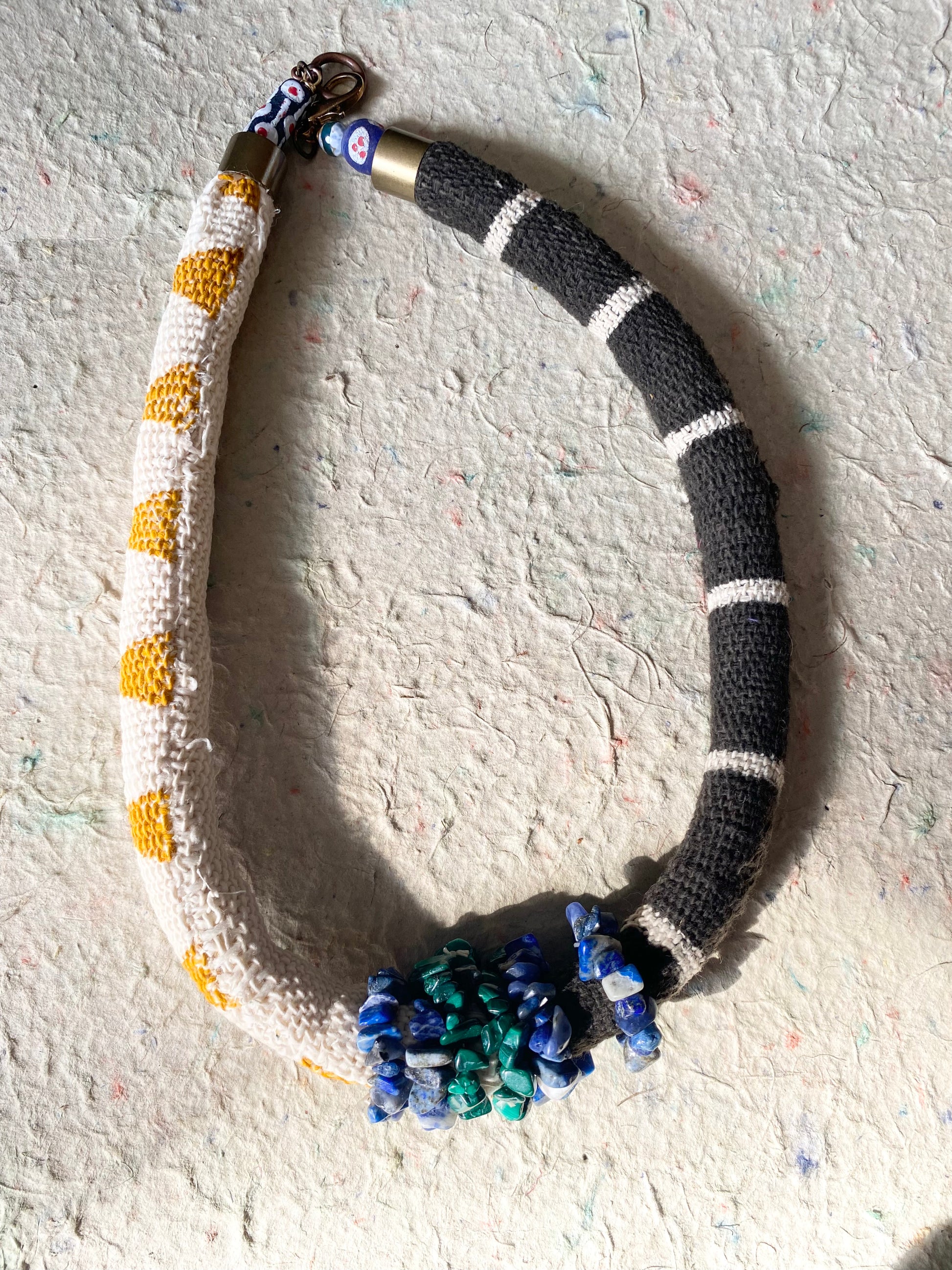 A duo of mudcloth patterns and colors were combined to make this cord necklace. The wraparound gemstone focal is made of malachite and sodalite/lapis lazuli.