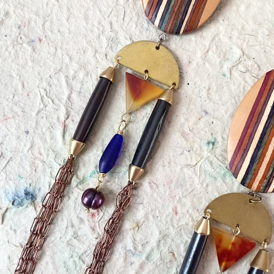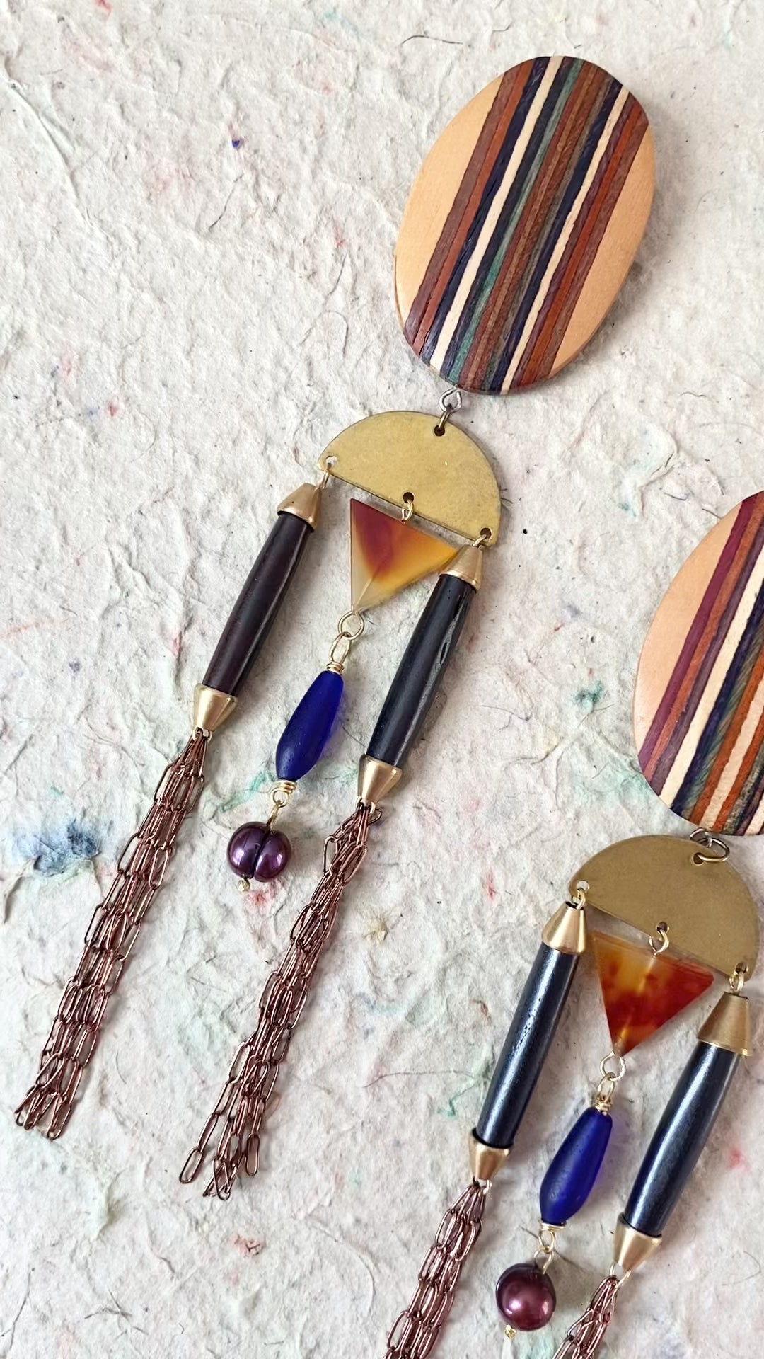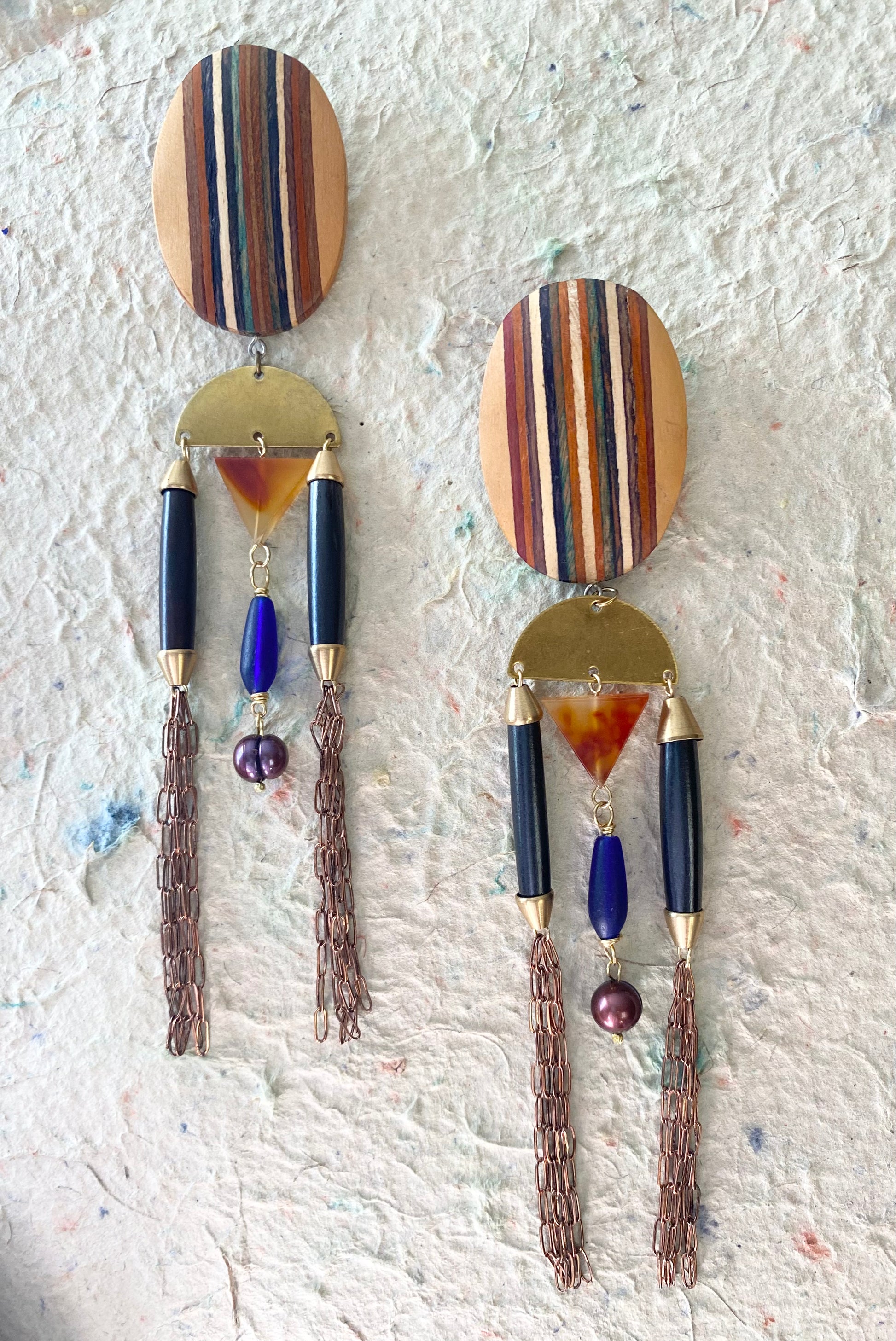I upcycled pieced wood earring drops, flipping them upside-down and turning them into posts and adding brass, gemstone, glass, horn, chain, and pearl components. This is a one-of-a-kind design.