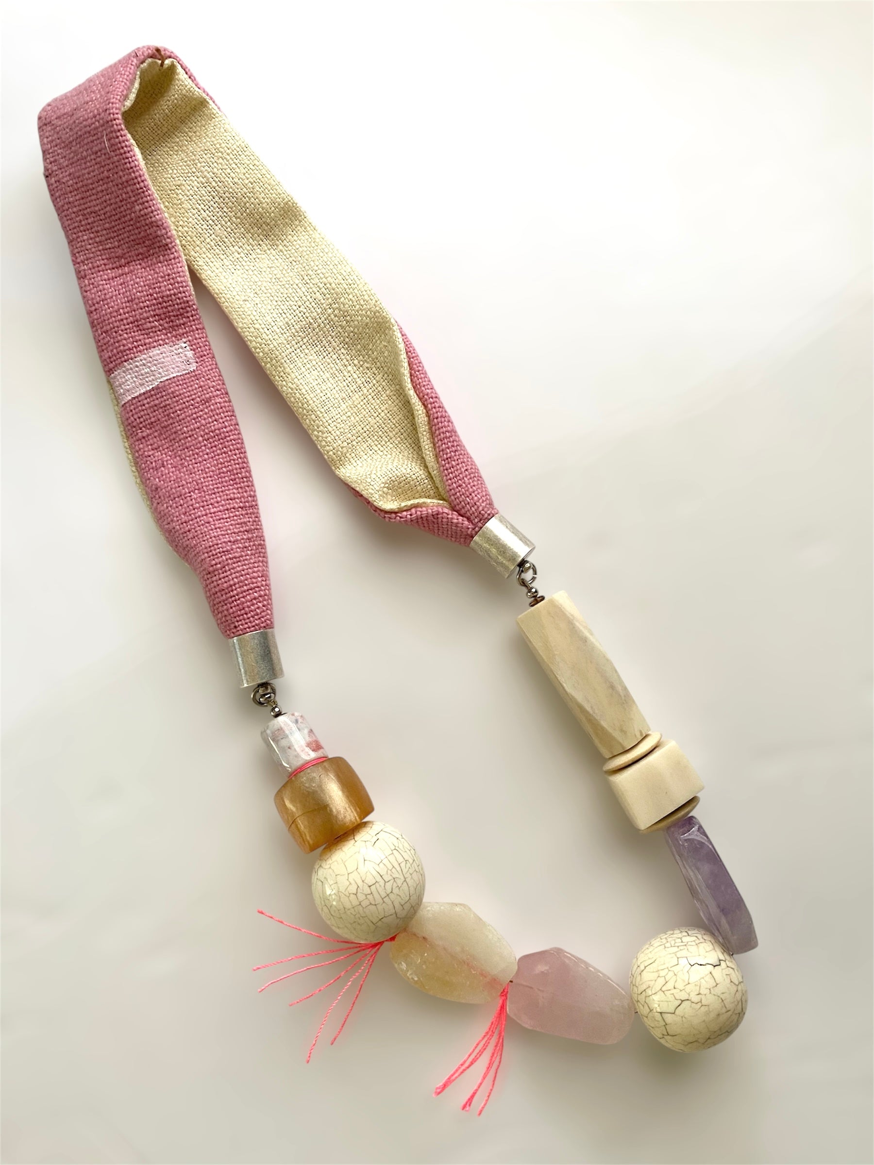A pink mudcloth strap with ivory silk lining is paired with jumbo beads of bone, wood, agate, acrylic, porcelain, and vinyl. The necklace measures 22 in/ 72 cm in length and slips over the head for easy wear. Additional fabric length (up to 5"/ 16 cm) is available at no cost; please message me if you require this adjustment.