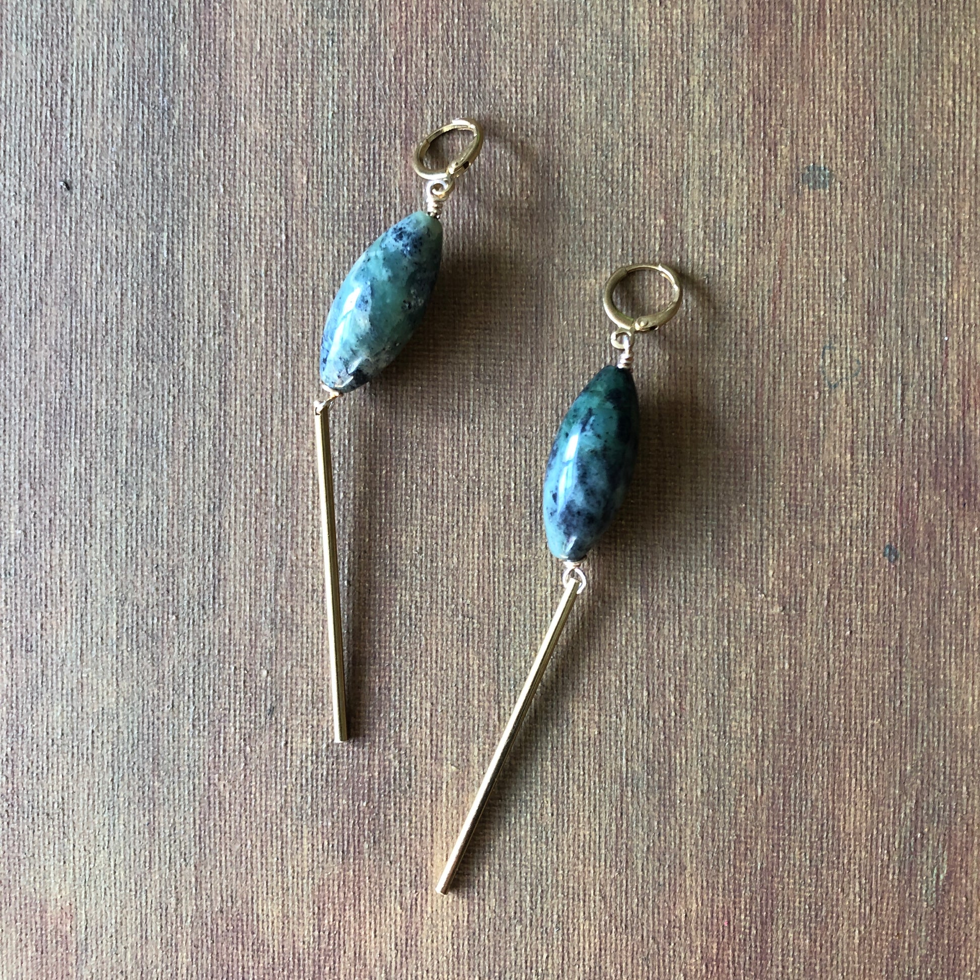 Slender dendritic jade beads and brass sticks are a simple combination that quietly speaks volumes. The earrings measure approximately 3.5" in length.