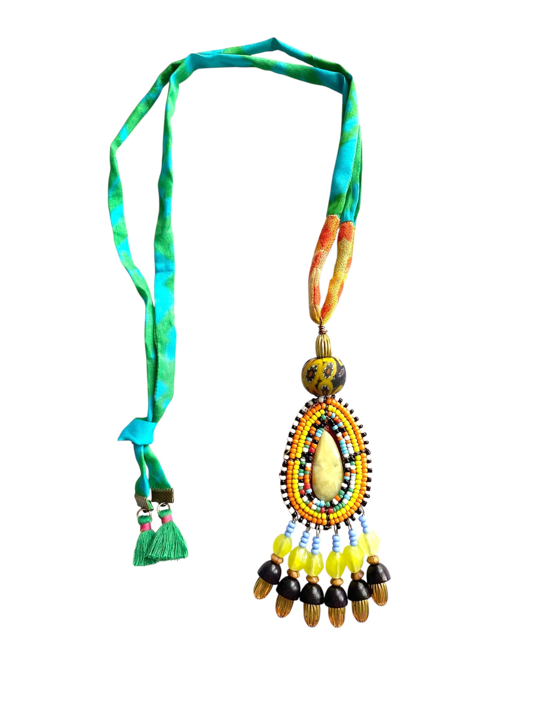 A Maasai-crafted earring is the foundational component for this colorful pendant necklace. I added a teardrop-shaped jade pendant to the center of a poly-filled textile backing and a fringe made of glass, wood, and brass beads. A glass millefiori bead sits atop the pendant, which hangs from a 34" tie-on strap I sewed from vintage silk and commercial textile remnants. This is a one-of-a-kind item.