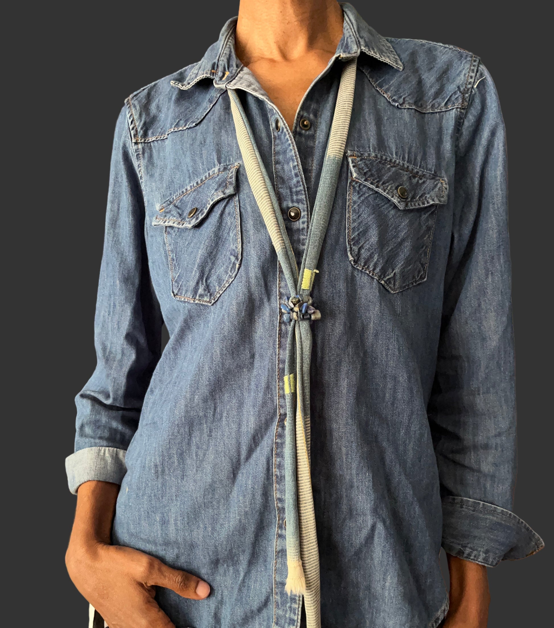 Crafted from an entire panel of African Baoulé cloth, an open-ended textile necklace offers multiple ways to wear it. An elastic band of mixed gemstone chips expands your options further, depending on where you choose to place it along the length of the tie. The neckpiece measures a generous 50" in length.
