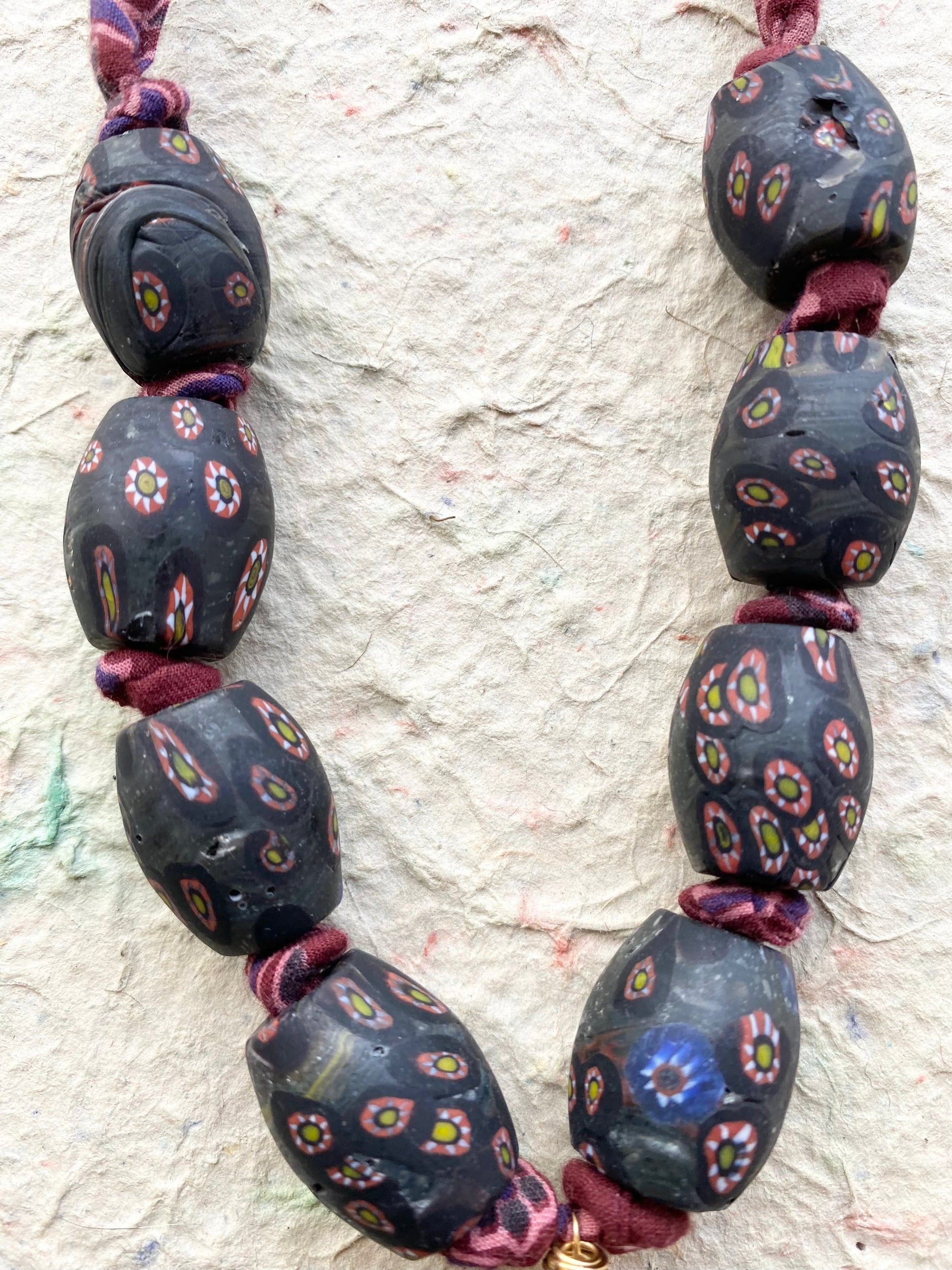 Chunky matte black millefiori beads are paired with a dragon's vein agate pendant and strung on cord made of block print cotton fabric from India. The necklace ties on, fitting around the neck at about 18" but can be lengthened upon request. This is a one-of-a-kind item.