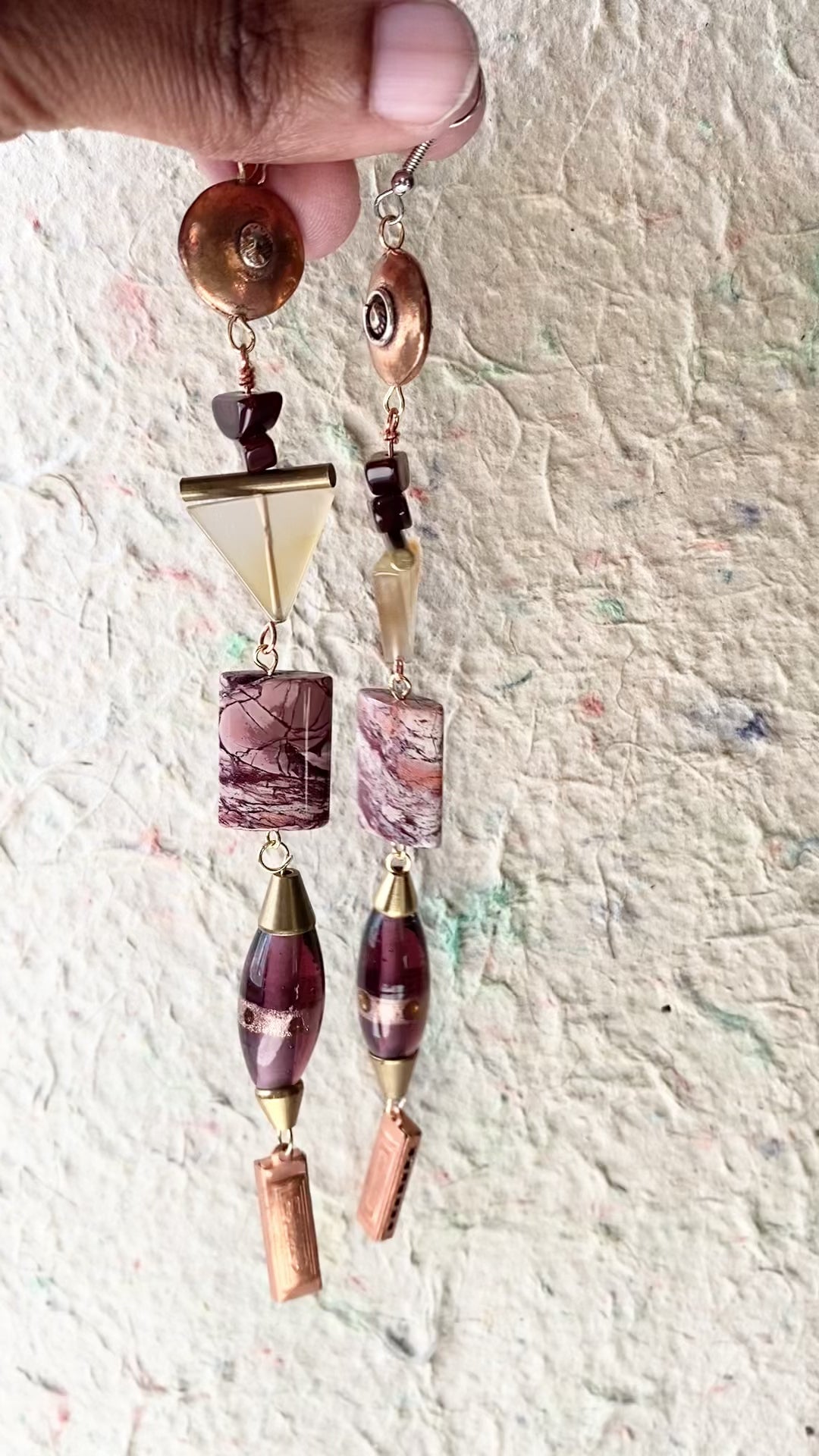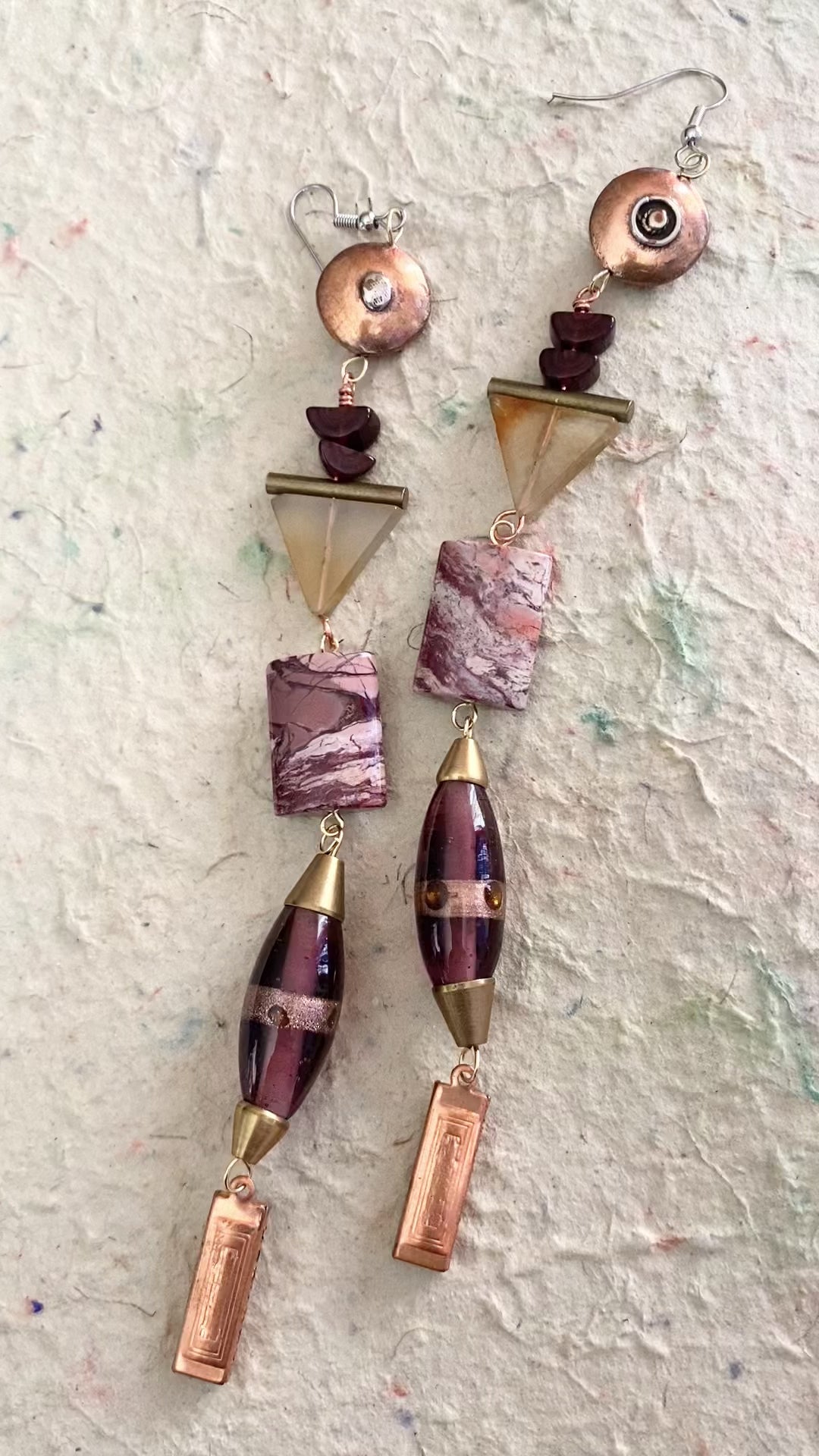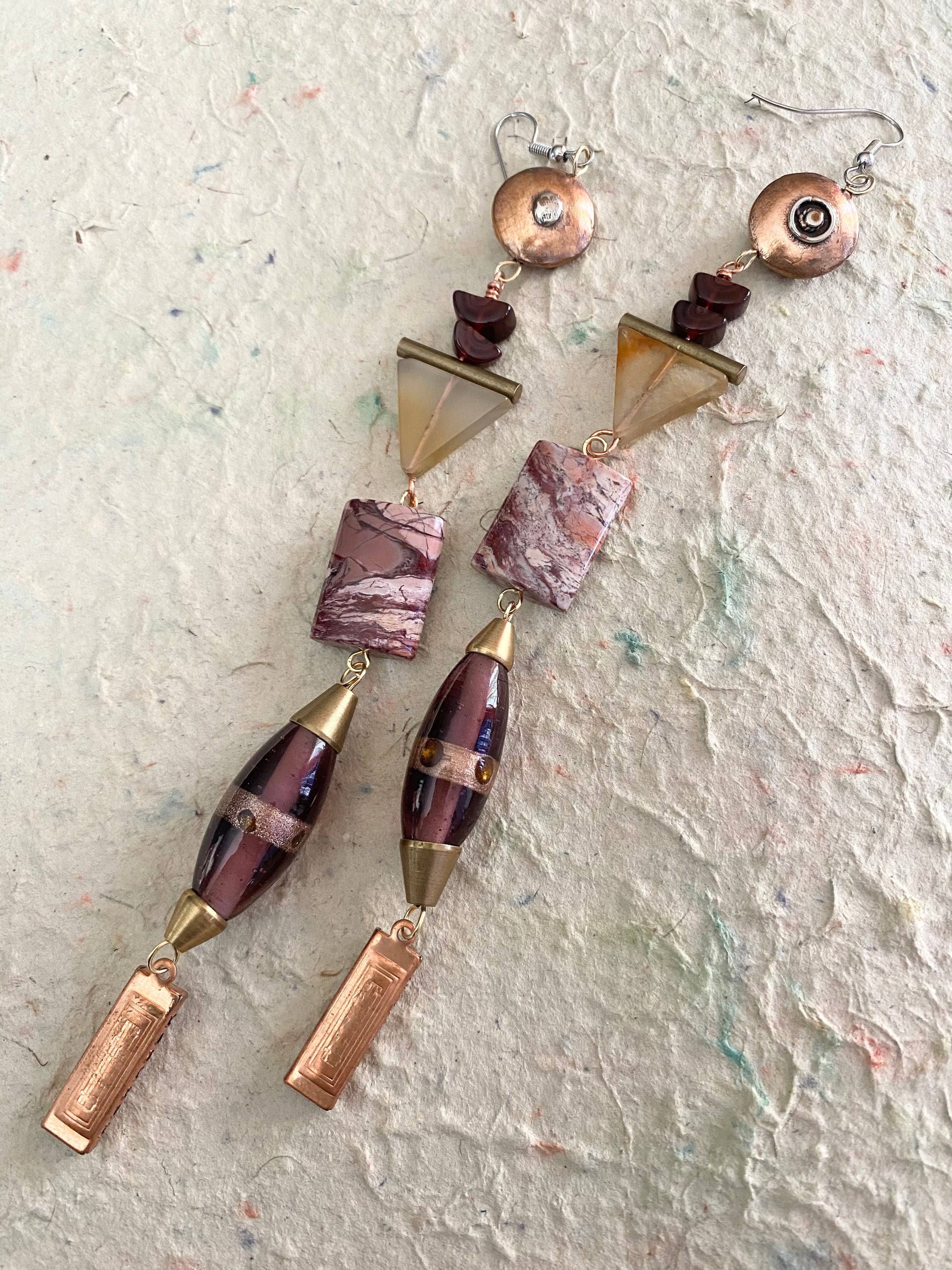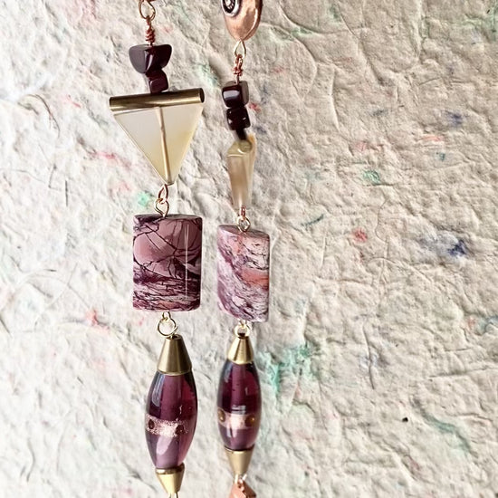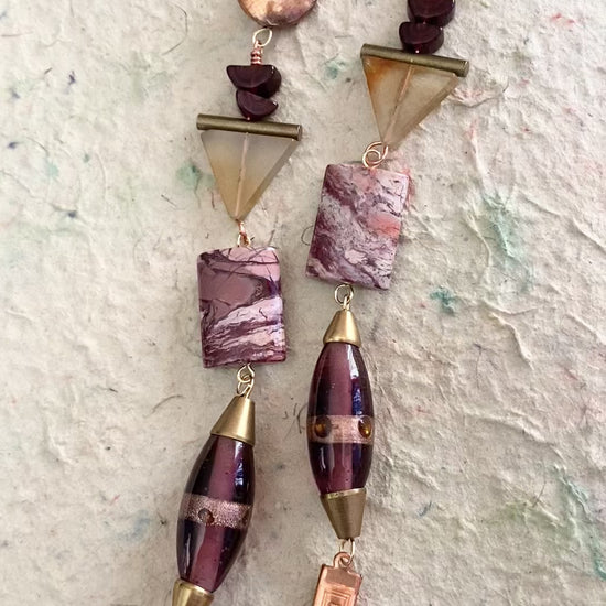 A deliciously long dangle featuring pink, purple, and coppery tones and including jasper, glass, copper, and carnelian beads.