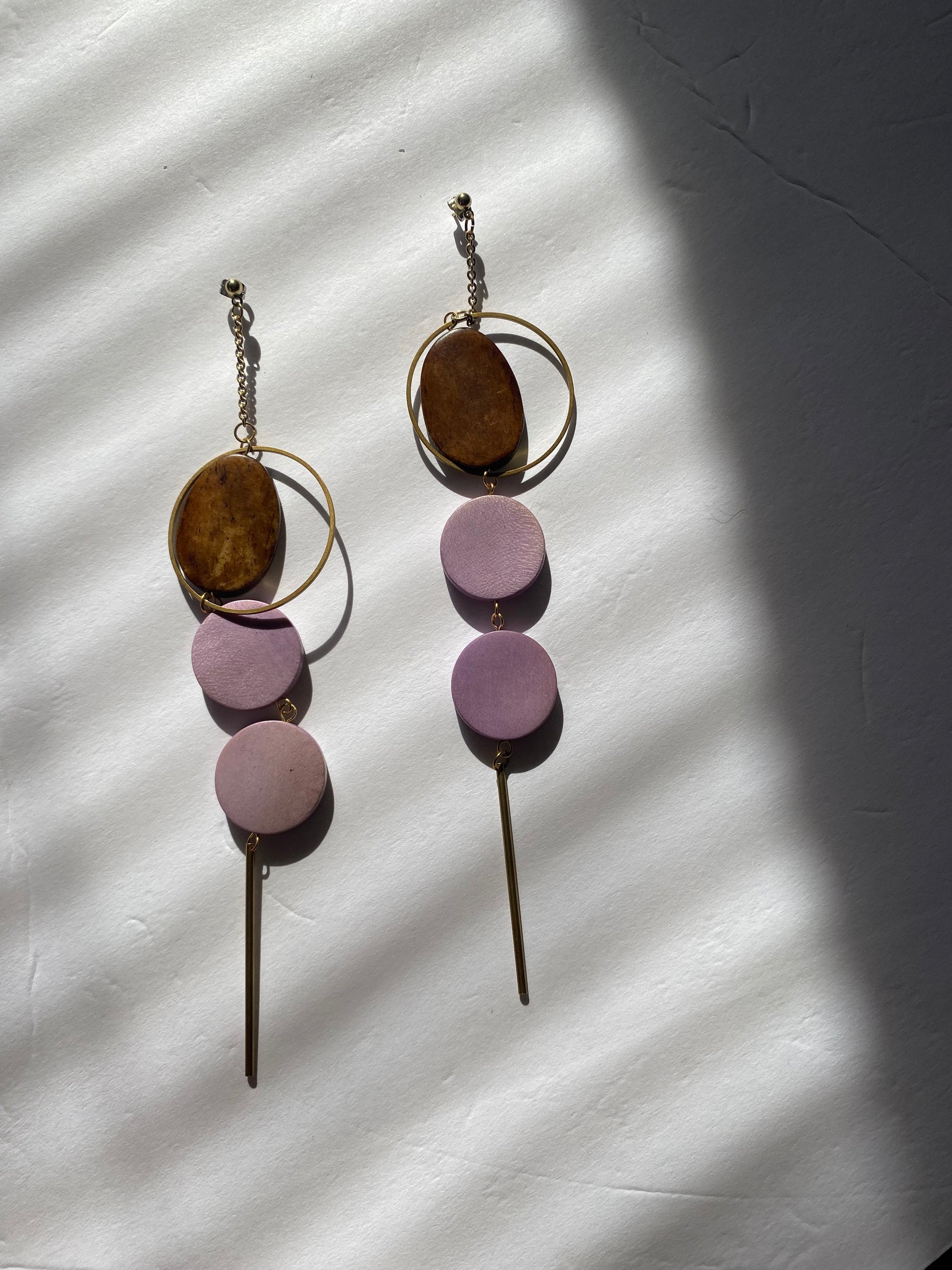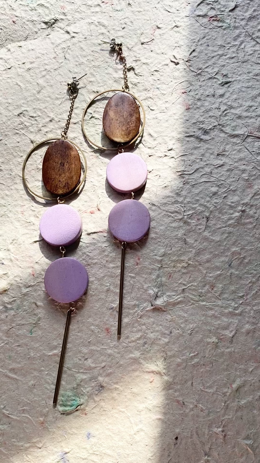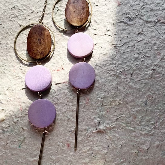 Two lavender wooden coin beads with a brass stick dangle are suspended from oval-shaped horn beads within a brass frame. Earrings measure 18 cm/7" from post to end and weigh .35 oz.
